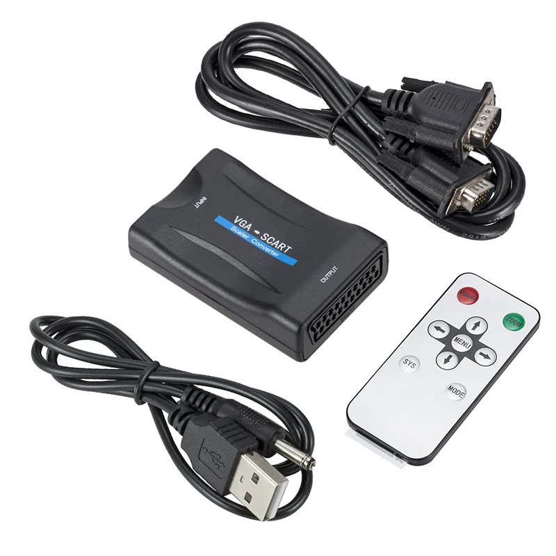 1080P VGA to SCART Video Audio Converter Adapter Digital Video Audio TV Signal Conversor With Remote Control Power VGA Cables