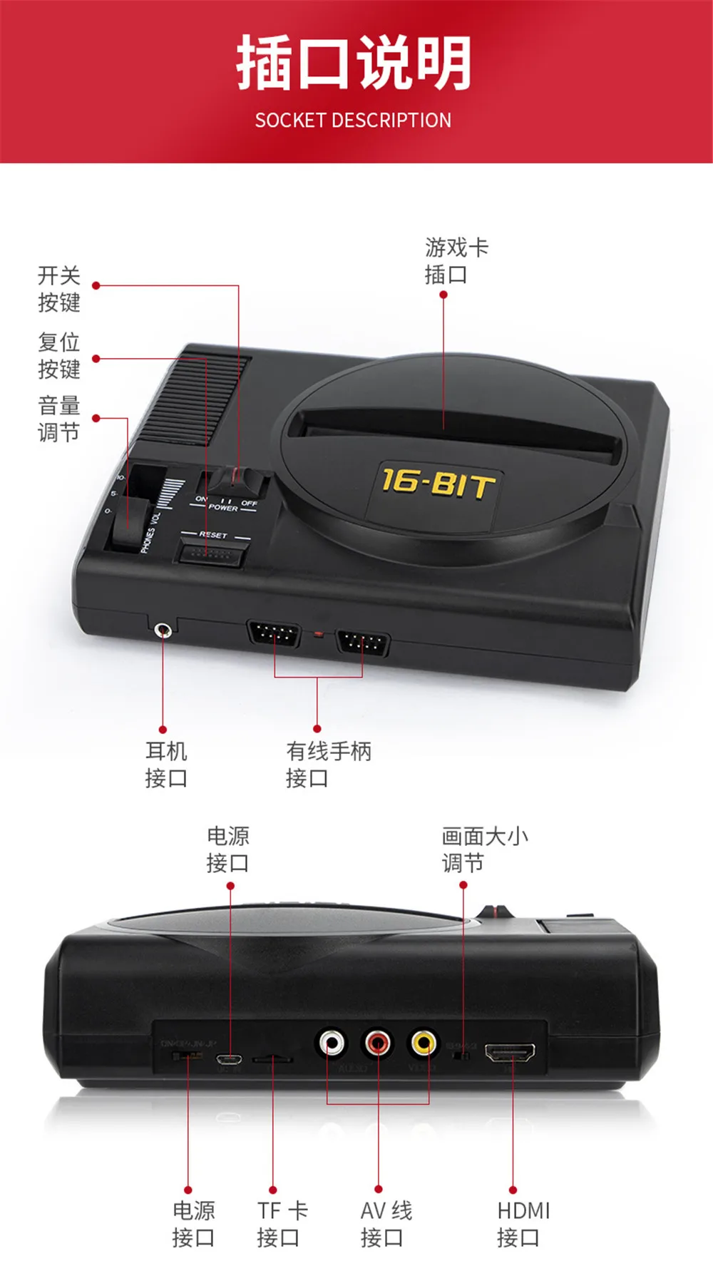 1. avec emplacement pour cartouche pour cartouches de jeu Genesis/Mega Drive; il peut jouer à des cartouches Genesis/Mega Drive. (la cartouche de jeu n’est pas incluse)